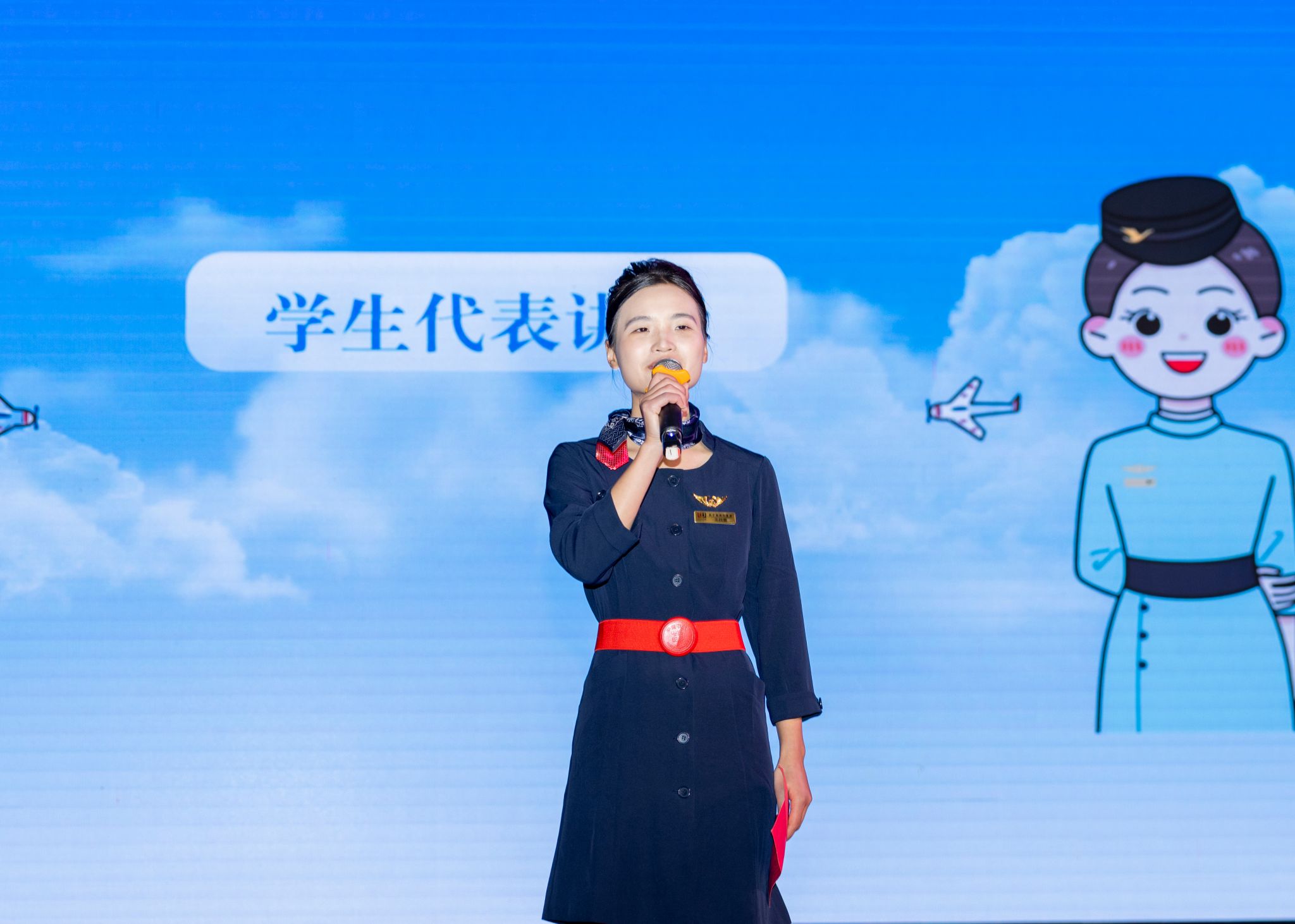 蒋卓芯带领全体同学高举右手庄严宣誓,表达将立志成为品德高尚、业务精湛的航空服务人才,为行业发展贡献智慧与力量。